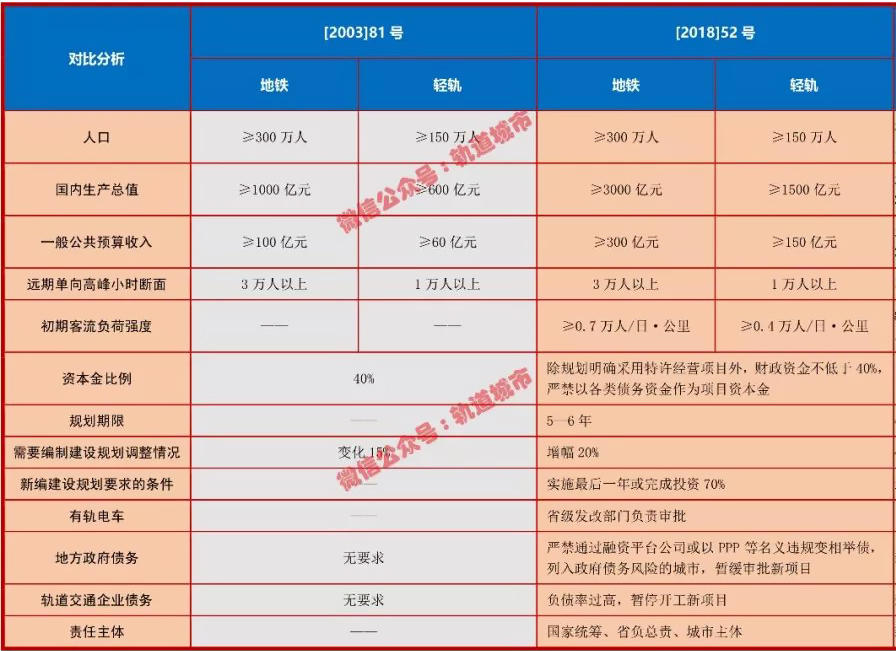 81号文与52文申报地铁城市条件对比。轨道城市微信公众号图片