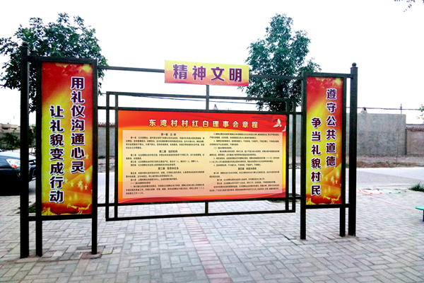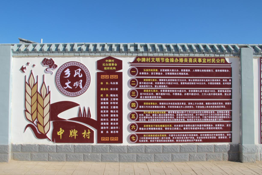二是突出村社宣传阵地建设和作用发挥。坚持因地制宜、因势利导的原则,在各村建立文化展示墙、乡风文明长廊、乡风文明宣传栏、村规民约展示墙等宣传阵地,广泛宣传“治理高价彩礼、推动移风易俗”等方面的内容,全市共建立移风易俗宣传栏2600多块。金川区宁远堡镇东湾村、龙景村及双湾镇陈家沟村、新粮地和永昌县南坝乡何家湾等村采用墙体绘画形式,在村民集中居住点制作了“移风易俗·文明新风”展板、墙绘,对村民进行直观、形象的宣传教育,成为乡村传播文明的新窗口,教育群众的新阵地。