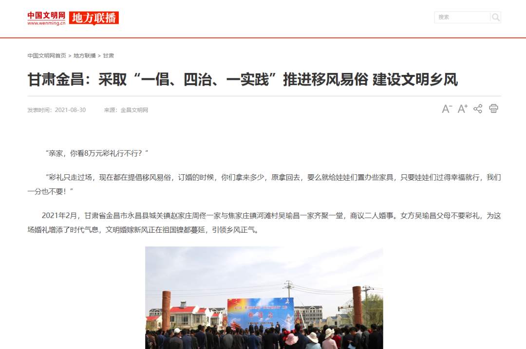 8月30日,中国文明网刊发了《甘肃金昌:采取“一倡、四治、一实践”推进移风易俗 建设文明乡风》的文章,报道了金昌乡村文明的新风尚。