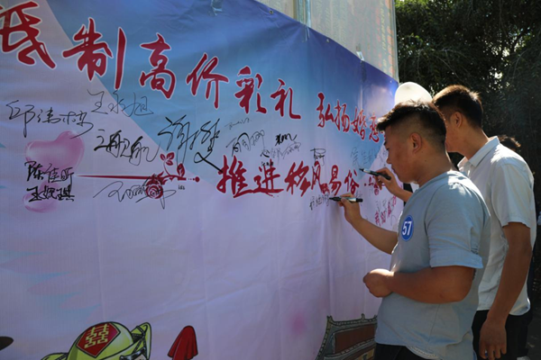 三是采取多种形式构筑无死角宣传攻势。以“思想培根”“精神铸魂”新时代文明实践金牌项目为载体,深入开展“文明新风进基层”“移风易俗我先行”等系列宣讲活动,通过“大讲堂”固定场所、固定时间定向式以及“大喇叭”全天候普及式和“小板凳”“小马扎”“休闲场所宣讲”“炕头院落宣讲”“田间地头宣讲”等流动式,充分利用群众碎片时间向群众宣传《民法典》《殡葬改革条例》等法律法规,广泛开展“反对高价彩礼,倡导婚嫁新风”教育引导,发放宣传彩页、倡议书、宣传纪念品,弘扬抵制高价彩礼、文明节俭办婚丧事宜、其他喜庆事宜不办的新风,通过多轮次、高密度的宣传,推进移风易俗已经成为人知人晓、民心所向的民生工程。