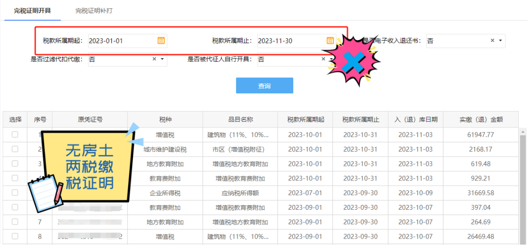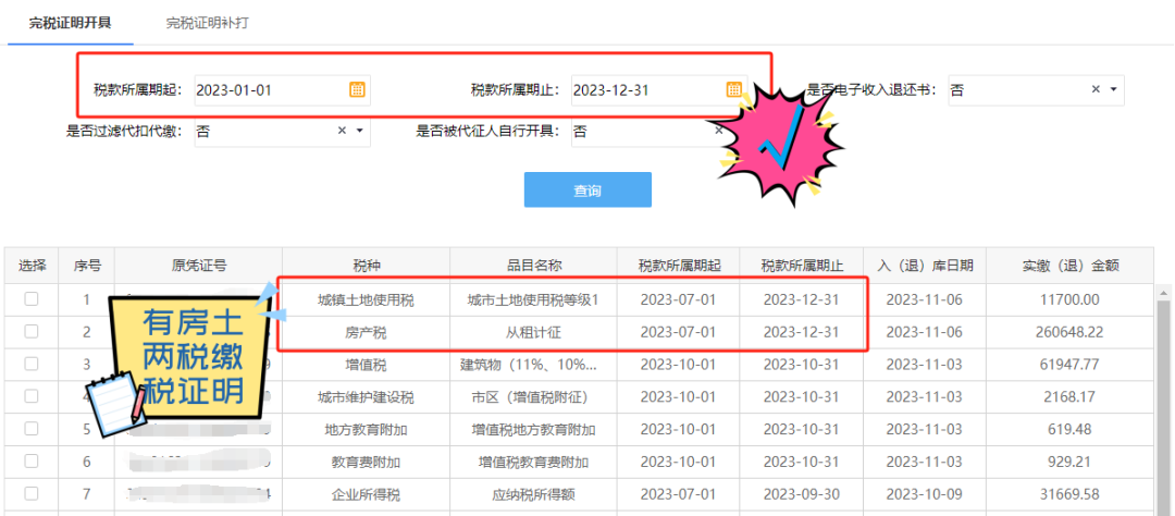 以开具属期为2023年7月1日至12月31日的房产税和城镇土地使用税完税证明为例。