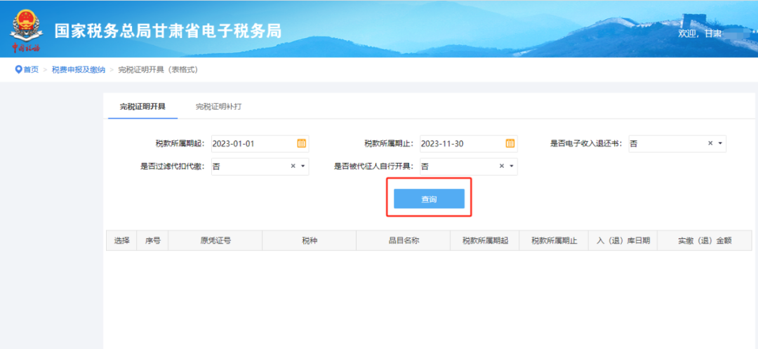 2.点击进入表格式或者文书式的开具功能,例如开具表格式完税证明,选择税款所属期后点击“查询”;