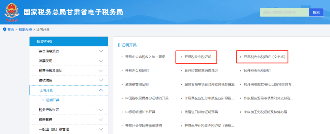1.搜索栏搜索“完税证明开具”,可快速查找;或者通过功能分类查找【我要办税】-【证明开具】-【开具税收完税证明(表格式或者文书式)】;