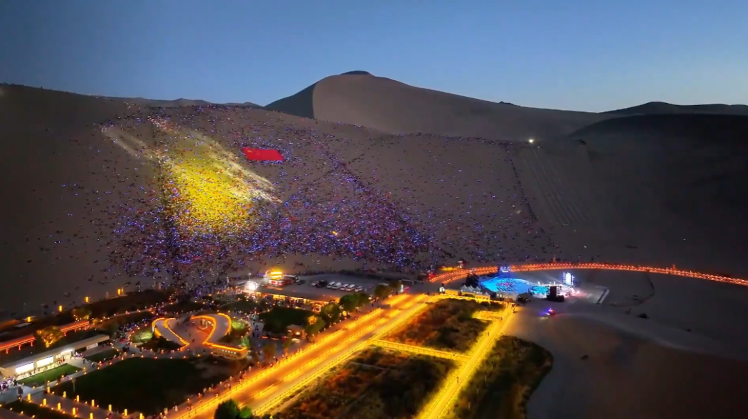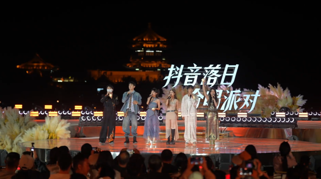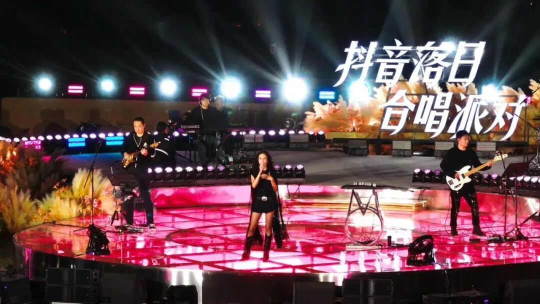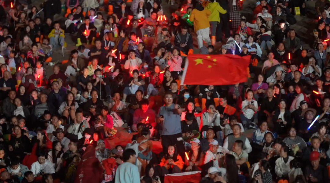 从“游客自发合唱”到“政府主导策划”,星空演唱活动已形成“主题策划+文化演绎+游客共创”的成熟模式。今年五一假期,星空演唱活动再次升级。5月1日,巨幅国旗在游客托举下徐徐展开,万人齐唱《我和我的祖国》,场面蔚为壮观,游客们沉浸在浓浓的爱国情怀之中。5月4日,敦煌市联合抖音平台举办的“抖音落日合唱派对”,由歌手周深携手抖音创作者李雨霏、王不染等嘉宾现场领唱,活动吸引线下游客数万人,线上直播间参与人数超800万人,相关话题#敦煌落日合唱派对#登上抖音热榜前三,单日播放量突破5亿次。8月29日,"抖音落日合唱派对"(七夕场)在鸣沙山·月牙泉景区浪漫上演。依托大漠落日与璀璨星空的天然舞台,邀请著名歌手许巍及多位抖音创作者,与数万名游客及线上数百万网友共唱一首歌,在丝路诗韵中共度浪漫七夕。此外,抖音落日合唱派对“国庆”“中秋”场活动分别于10月1日、10月6日在鸣沙山月牙泉景区浪漫举办。