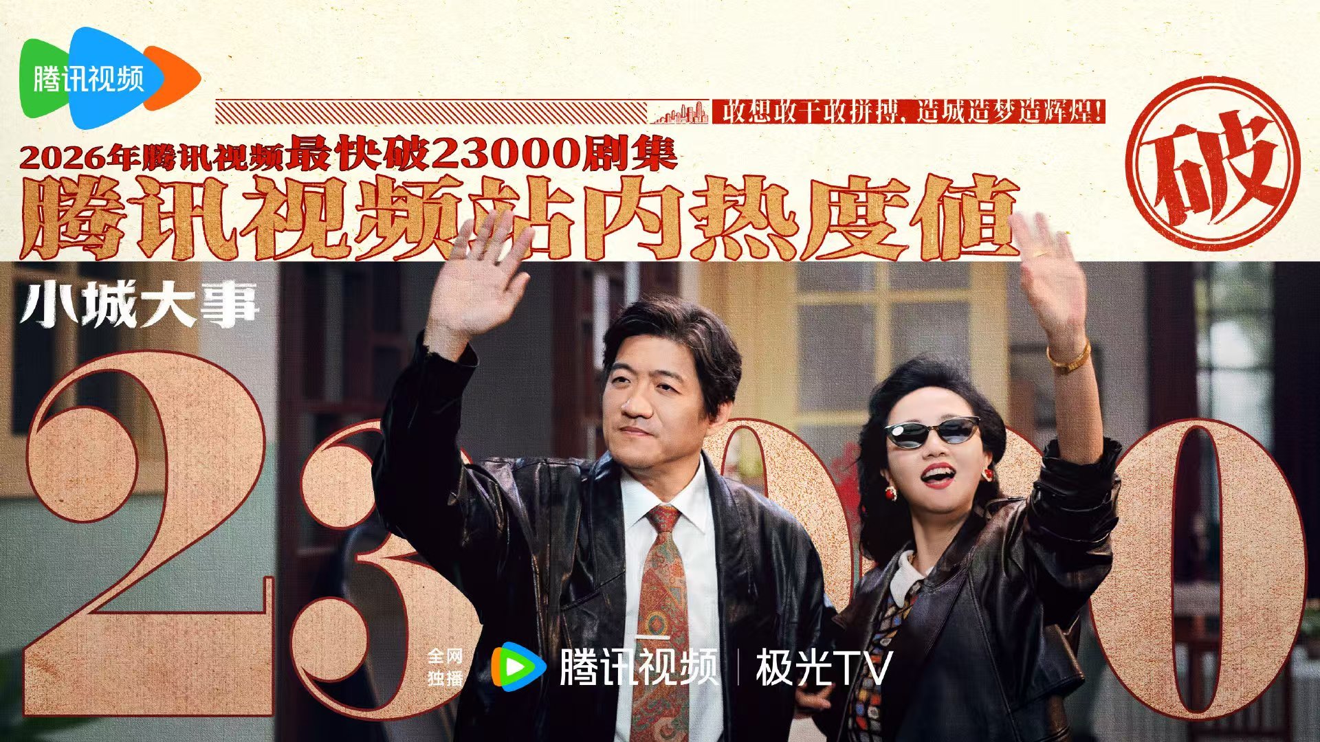 根据朱晓军报告文学《中国农民城》改编的电视剧《小城大事》,今晚(1月10日)正式登陆央八电视剧频道与腾讯视频。截至22时,本剧在腾讯视频站内热度值已突破23000,为本年度最快达到这项成绩的剧集。同时央视八套收视率10分钟破2%,15分钟达2.31%,首集峰值冲至2.6%,全程稳居全频道收视榜首。