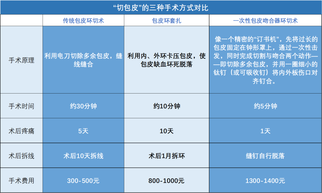 目前包皮手术技术已较为成熟,并趋向微创。主流方式包括传统包皮环切术、包皮环套扎术以及一次性包皮吻合器环切术,手术时间与费用各有差异。