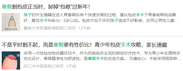 ◎近期,各大医院纷纷发布寒假包皮手术相关信息。/图:网络截图