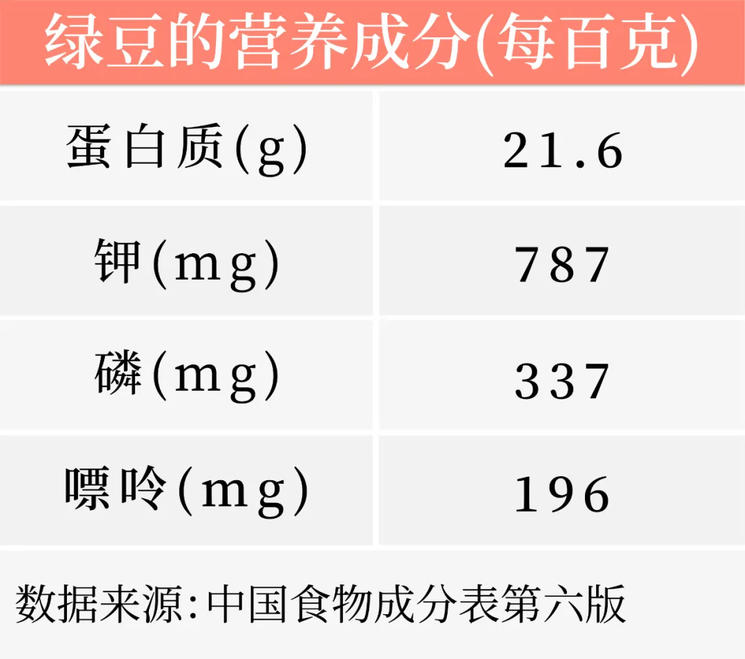 其他肾友可以正常吃绿豆,每次推荐25g,25g绿豆约含5.4g蛋白质、84mg磷、197mg钾,控制好量并不会引起蛋白质、钾、磷摄入超标。