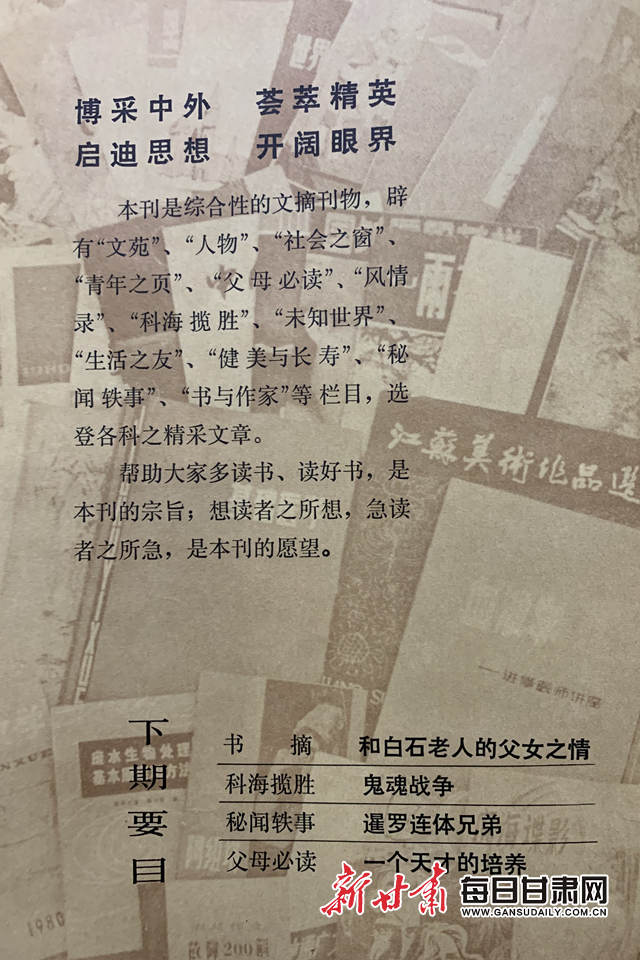 “你们可以看到,‘博采中外,荟萃精华,启迪思想,开阔眼界’的办刊方针在创刊时就确定并公布了,而这一办刊方针38年来一直没有改动过。”指着《读者文摘》创刊号封二的内容,胡亚权介绍说:“这十六个字讲了三层意思,一是文章内容和范围包含古今中外,没有时空限制;二是我们选的文章都是精华、都是精心挑选的好文章;三就是要让读者开阔眼界。”