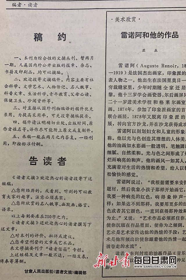 “改革开放初期的1980年,正是人人渴望读书的时候,我形容那是个‘文化断层时代’。”胡亚权说起《读者文摘》创刊之时的事情依然记忆犹新。“那一年,时任甘肃人民出版社总编辑的曹克己,找到了我和郑元绪,告诉我们出版社打算办一份杂志。那时,我俩不但年轻,而且都是理工科出身,两人之前都没有太多杂志编辑方面的经验,当时第一时间想的就是到底要办一本怎样的杂志?于是我俩跑‘地下书摊’(当时夜市上的小地摊中多以小杂志、手抄书等为主)、新华书店(当时也没有多少可看之书)、报刊市场(兰州市面所常见报刊不超过20种)作了大量的调研工作。”