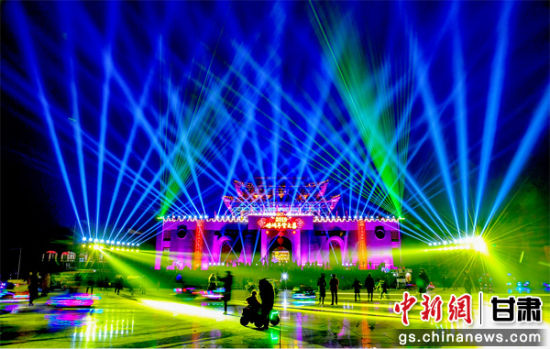 2月14日晚,甘肃平凉市崆峒山下崆峒古镇上演灯光秀,点亮“道源圣地”崆峒山,璀璨夺目的灯光让古镇变成不夜城。此次灯光秀是崆峒古镇“年货大集”活动内容,春官赛、广场舞、旗袍秀等本地民俗文化展演和崆峒武术、崆峒笑谈、华阴老腔等非遗节目为民众带去新春祝福。徐振华 摄
