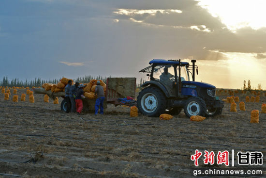 秋日里,甘肃张掖市高台县许三湾戈壁滩上的共裕农牧产业园内,3000亩马铃薯进入收获期,100余名工人正在田间采挖马铃薯并装袋装车。据了解,今年该产业园种植有种薯、商品薯等5个品种,预计年产量可达上万吨,主要销往内蒙古、上海、江苏等地。通讯员 郑耀德 摄