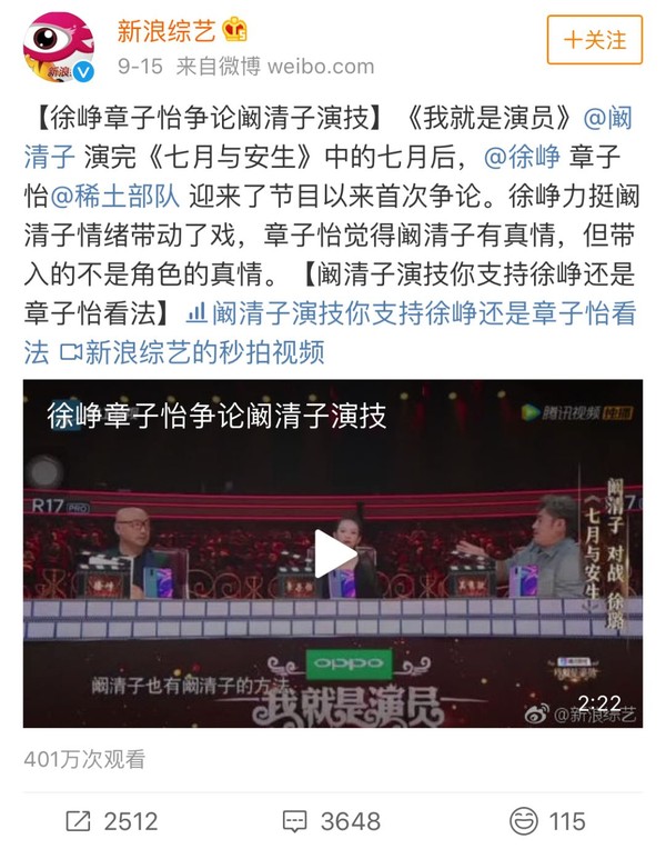 不过这还不是最让人无语的,最关键的是热搜上评论人数最多的这条微博,发的视频里根本就没有阚清子表演片段、也没有章子怡对阚清子的点评,截得只有后半部分徐峥反驳章子怡的part……