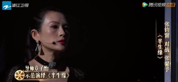 后来在导师的指导下张馨予又演了一遍开头“进门”的这段儿,虽然有进步但还是不尽如人意,于是主持人张国立老师就当场邀请章子怡用这段戏来个亲身示范