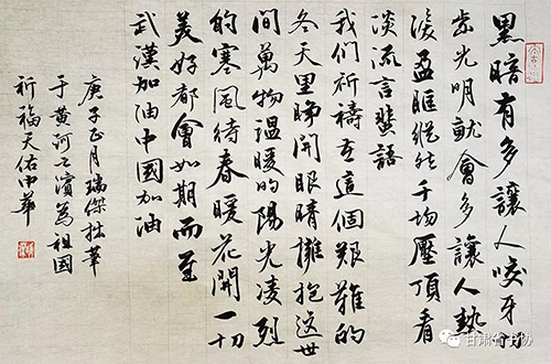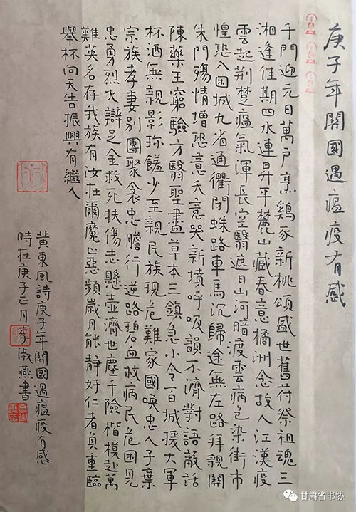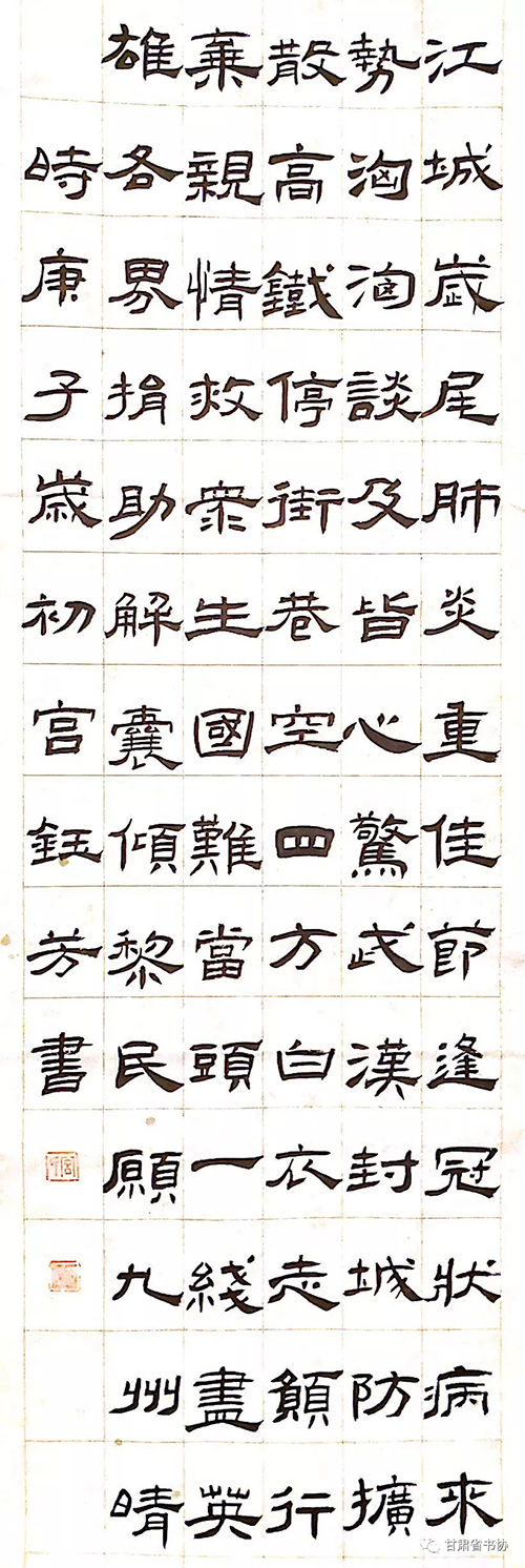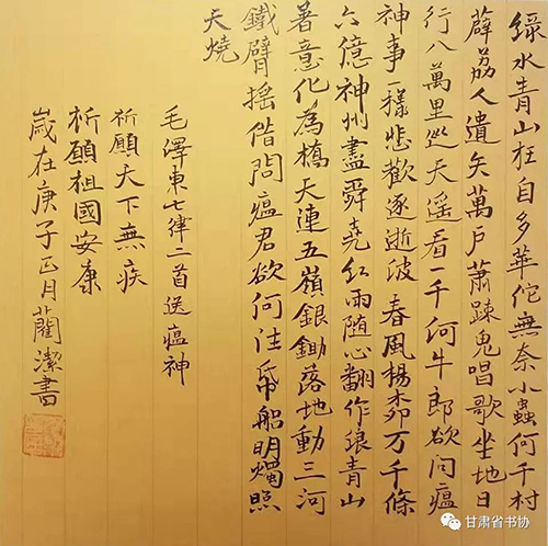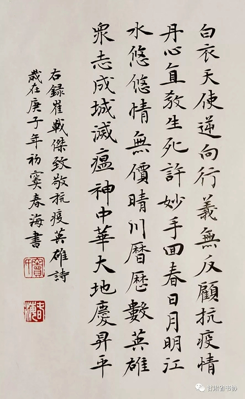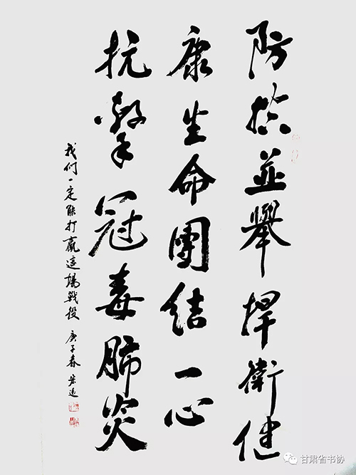 为深入贯彻落实习近平总书记关于疫情防控工作的重要指示精神,我们举办了“甘肃省书法家协会‘众志成城 战胜疫情’主题书法创作网络展”,希望全省广大书法家与全国人民一道,展现出甘肃书法人的责任和担当,积极投身到疫情防控工作中,用手中的笔墨加强疫情防控宣传,创作出鼓舞人民斗志、凝聚人民群众全面抗击疫情强大正能量的书法作品,助力武汉、助力甘肃、助力全国,共克时艰,战胜疫情。现按来稿顺序予以刊发。