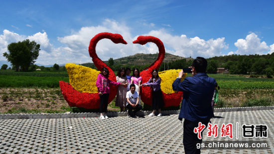 甘肃临夏古称河州,是中国两个回族自治州之一,地处青藏高原与黄土高原的过渡地带,素有“西部旱码头”之称。近年来,在官方和民间共同努力下,旱塬覆绿,作为临夏州临夏市唯一山区村的王坪村,平均海拔2130米,6月1日,油菜花和牡丹已盛开,吸引民众观赏美景。 图为游客在王坪村景观带上,与天鹅造型饰品合影留念。马玉林 摄