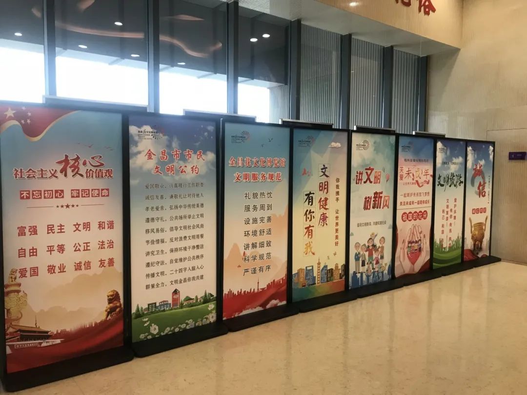 馆内大厅摆放了社会主义核心价值观、“讲文明、树新风”、“关爱未成年人”等公益宣传展板。售票口设有“保持一米线距离”提示标识,同时为了更好的推广全民阅读,在一楼展厅设置了阅读驿站,680本图书供游客们随时阅读,此外还设置垃圾分类广告牌及垃圾分类箱,加强宣传力度,营造创城氛围,提高广大市民的知晓率、参与率和满意率。