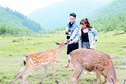 近日,游客在渭源县田家河乡元古堆村与当地放养的梅花鹿零距离接触。