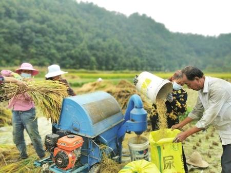 9月19日,康县大南峪镇花庙村村民王建林家正在收割水稻。花庙村有优越的光热水土资源,主要农作物以水稻和油菜为主,今年种植的400多亩水稻,目前已全面进入收割期。本报通讯员 黄培军 摄(陇南日报)