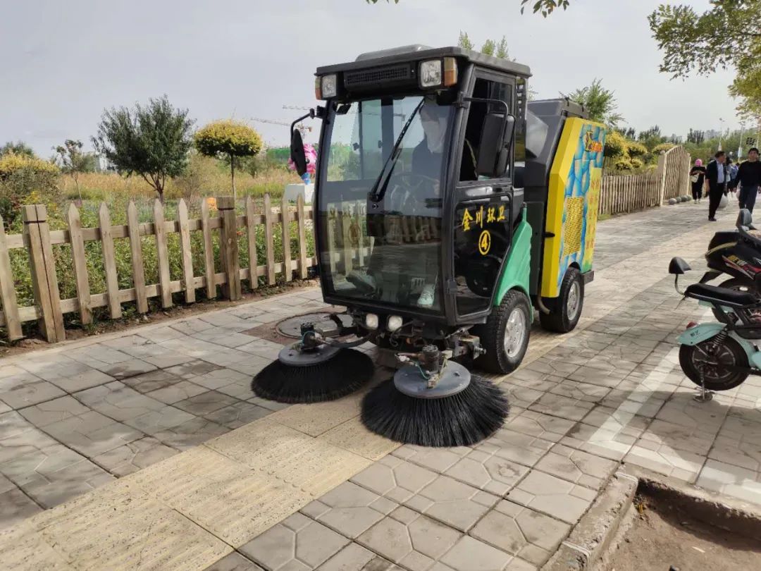 位于天津路的甘肃有色冶金职业技术学院门口,四辆清扫车和洒水车缓缓通过,路面顿时变得干净了起来,一个个橙色的身影推着垃圾回收车,提着垃圾收纳匣,穿梭在马路上打扫卫生。