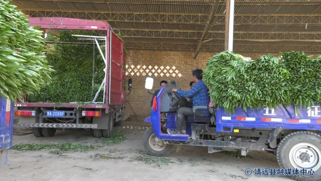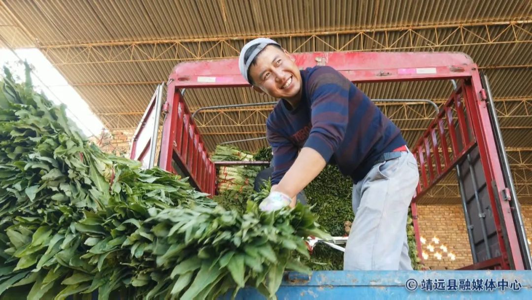 在合作社大院里,来自全国各地的收购车辆进进出出,络绎不绝,合作社负责人张红红正忙着过秤、记账,将硕大翠绿的莲花菜装车。