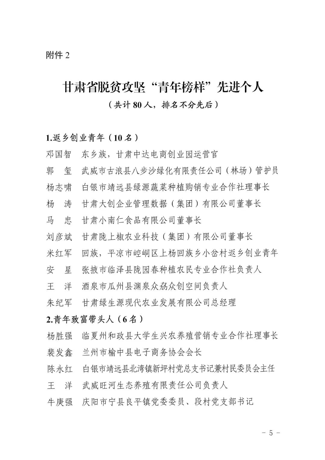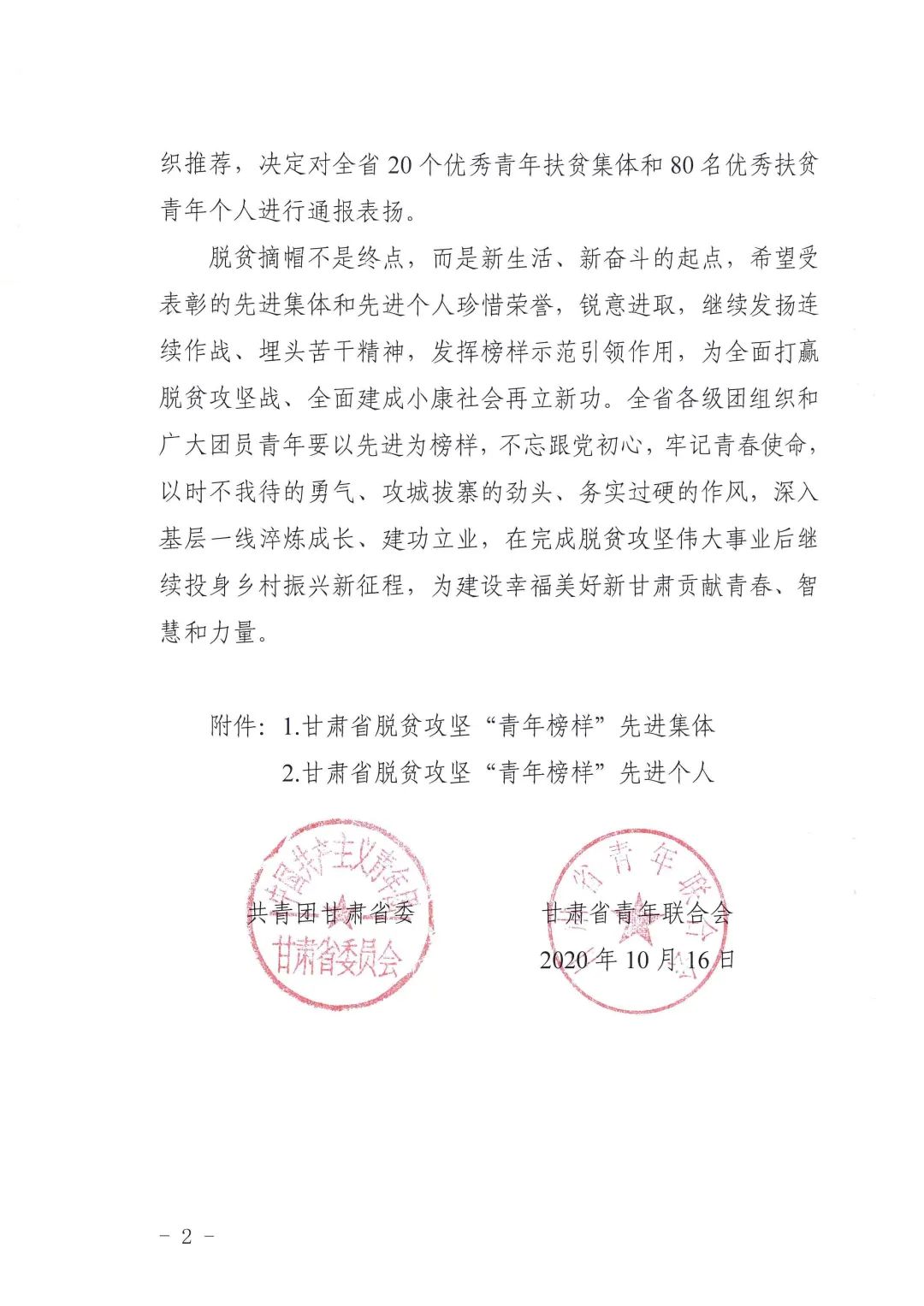 近日,共青团甘肃省委、甘肃省青年联合会联合发文通报表扬脱贫攻坚“青年榜样”先进典型,金昌市金川区委组织部四级主任科员、金川区双湾镇天生炕村第一书记、驻村帮扶工作队队长陈亚蕊同志光荣上榜。