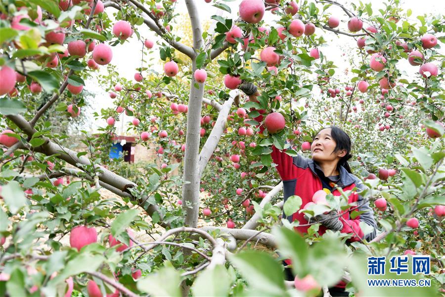10月26日,甘肃省临夏回族自治州永靖县岘塬镇姬川村的果农在采摘苹果。 近年来,甘肃省永靖县不断调整优化农业产业结构,利用“企业+合作社+农户”的发展模式,打造以苹果为代表的特色林果产业。目前,该县果园面积2万多亩,年产果品约3500万公斤,有效带动贫困群众增收。新华社发(史有东 摄)