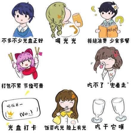 提出“光盘”行动就是要拒绝“舌尖上的浪费”,而部分学生还存在浪费食物、缺乏节俭意识的现象,需要加强引导和管理。为此,甘肃政法大学开展“光盘行动”主题宣传教育活动。创新创业学院副院长、艺术学院视觉传达设计专业副教授海妙老师指导6位同学,利用自己所学的专业知识技能,做出了以“光盘”行动为主题的4套不同风格的表情包。内容代表着生活中不同群体、不同年龄阶段的人们,倡导他们厉行节约、“光盘”至上,共同为全社会营造浪费可耻、节约为荣的氛围而出力。