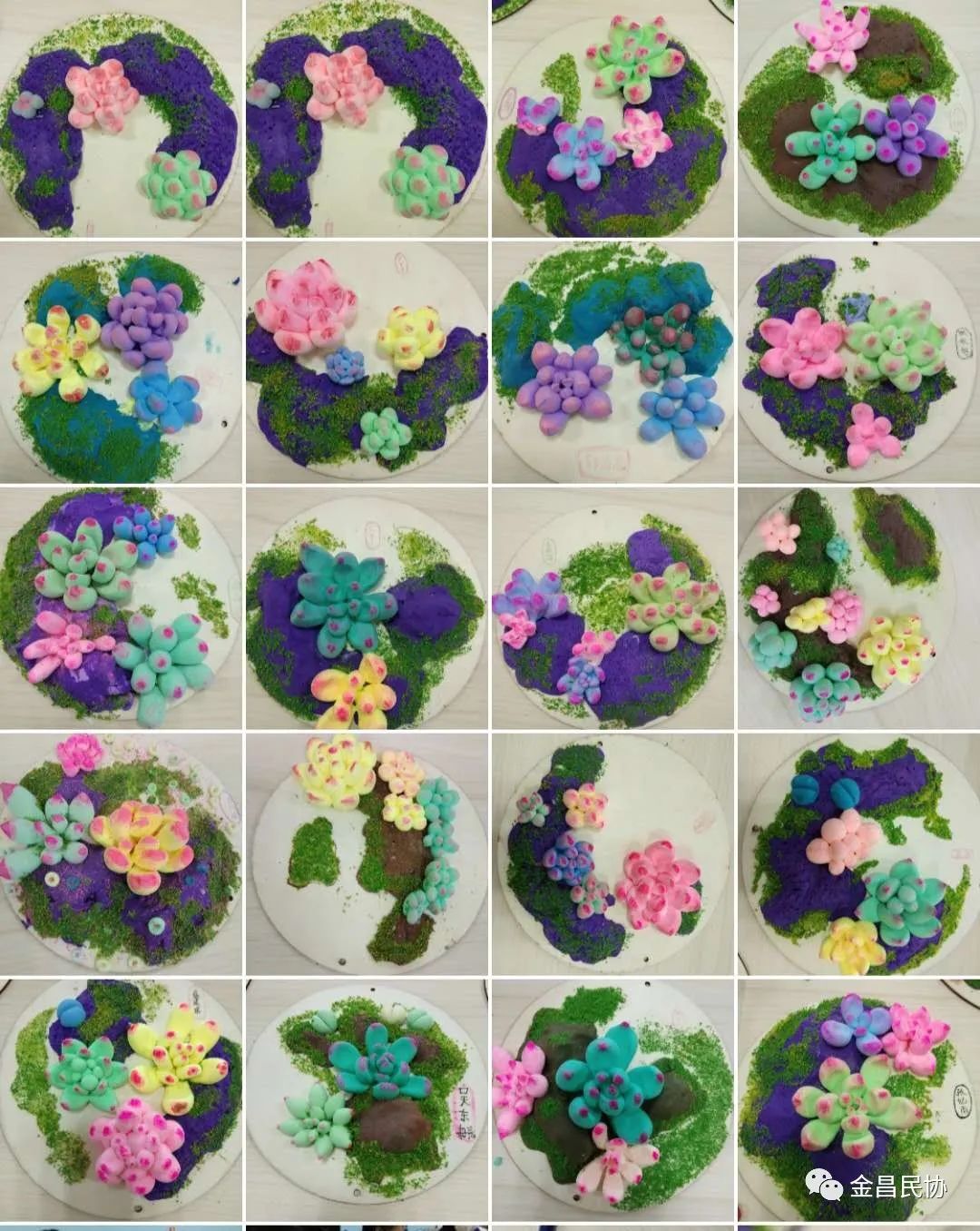 今天的面塑课内容是制作多肉植物作品。为了让肉肉植物更加生动形象,在上节课的基础上,增加了肉肉的上色方法和绿色植被的铺垫方法,唯一不足的是最后的落款,有些孩子没听明白,直接把作品名称和个人姓名横着签到了画面中心的位置,影响了画面效果。下次老师也一定注意给学员们讲明白讲清楚,需要监督指导学员按照要求落款。落款也是画面的一部分,但不能影响画整体面效果。