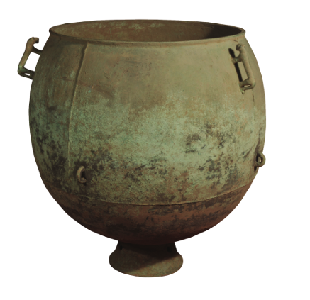 虎耳环扣青铜鍑,出土于 凉州区张义镇河湾村,战国, 口径87厘米。 腹径 109 厘米 , 通高 118 厘米。 口沿下至肩部均匀分布着 3 个虎 形耳,虎作站立状,长身直背 , 首尾下垂 , 圆圈形眼,“ n" 形嘴 , 张口龇牙。 下腹部对称分布 4 个环形系 , 圈足上分布有对称的 3 个圆形镂孔。