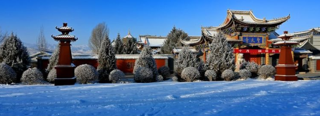 雪后踏访和朝圣陇上名庵,别有一番情趣和感受。青松和翠柏的枝头,挂满了明净的雪花,一株松,一株柏,恰似一座亭亭玉立的白色吉祥佛塔。梨树和杨柳的枝枝桠桠上,缀满了晶莹剔透的冰花,乘着微风上下左右摇摆舞动着,显得婆娑而妩媚。数十只蓝翎鸽在殿宇上空和大悲楼的周遭飞舞徘徊着,一只喜鹊降落在钟楼的顶端,放开喉咙鸣叫了几声,又自由自在地展翅飞走了。骤然间,温暖的阳光徐徐融化了殿宇和树枝上的冰雪。重重殿宇的廊檐和松柏杨柳的枝头,奏响了脆生生的滴滴答答的音符,混合着殿角铃铛因风撞击的叮当声,浑然天成了一曲美妙和谐的旋律。