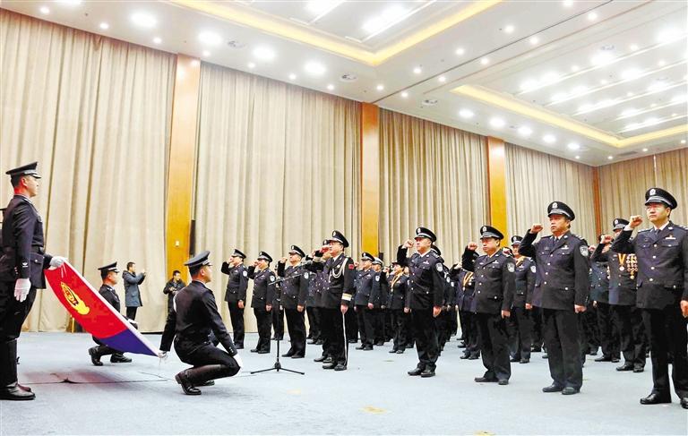 “人民公安为人民,我们的名字在警徽中闪光;人民公安向前进,我们的光荣在国旗上飞扬。”1月8日,省公安厅庆祝首个“中国人民警察节”座谈会在昂扬的《中国人民警察警歌》声中拉开帷幕。向警旗宣誓,为从警40周年、新晋升警监警衔民警和2020年冬季大练兵实战演练成绩突出个人代表颁发纪念牌和证书……一系列形式多样、鼓舞人心的庆祝活动展开。 兰州晨报·掌上兰州记者 张秀芸 摄