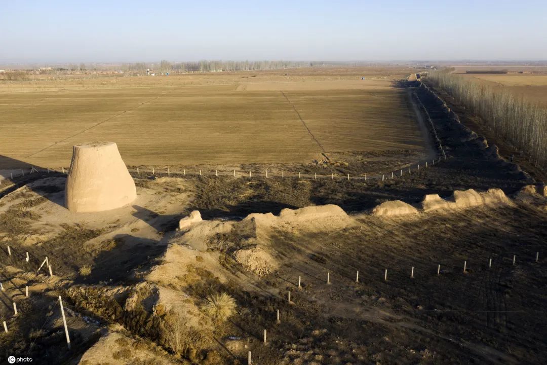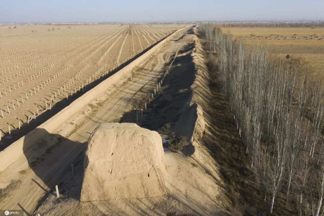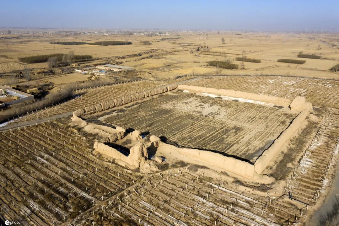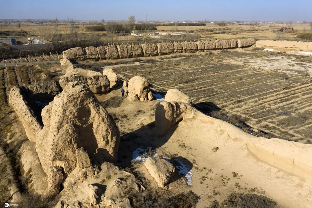 2021年1月19日,俯瞰甘肃省武威市凉州区长城镇头道营营堡遗址。凉州区因所处历史地理位置特殊,有着丰富的长城资源。据长城调查资料显示,在凉州区境内长城总长达63.2公里,至今约三分之二的墙体残垣尚存、共有烽燧53座、关堡6处,这些遗址均系黄土板筑,有些烽台燧墩保存较好,墩呈圆锥形或正方形。