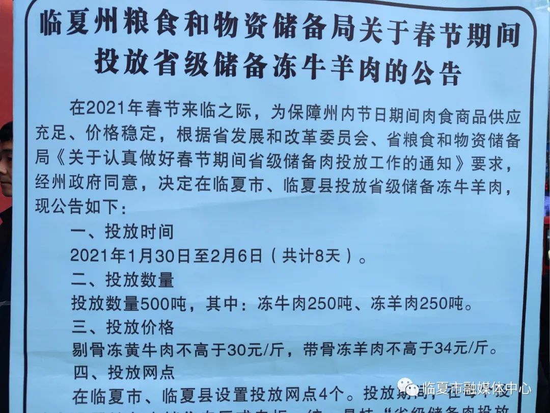 春节将至,为保障临夏牛羊肉市场供应,稳定春节期间牛羊肉市场价格,满足各族群众对肉类品的消费需求,根据省发展和改革委员会、省粮食和物资储备局相关文件要求,决定在临夏州内投放500吨省级储备冻牛羊肉。