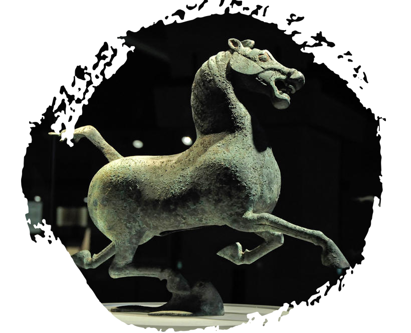 1969年出土于甘肃省武威雷台一号汉墓的铜奔马,造型矫健精美,作昂首嘶鸣、疾足奔驰状。三足腾空,右后足踏一飞鸟之上,飞鸟展翅,惊愕回首,显示了奔马疾快如飞,神速超越的意境,而奔马全身的着力点集中于一足之上,既表达了奔马以风驰电掣般的速度超越了飞鸟,同时又巧妙地利用了飞鸟的躯体以及展开的双翅扩大了着地面积稳定了重心,其造型完全符合结构力学平衡原理。