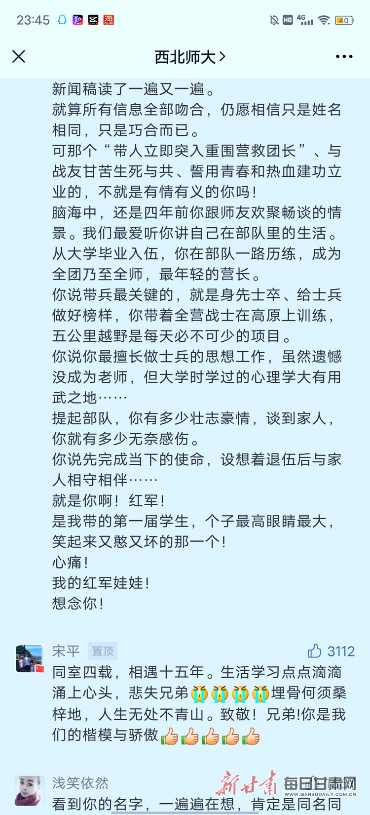 2月19日,西北师范大学官方微信公众号发布了题为《致敬英雄校友丨红军:卫国戍边英雄,永不褪色的界碑!》一文。文章留言中校友洒泪追忆“卫国戍边英雄”陈红军