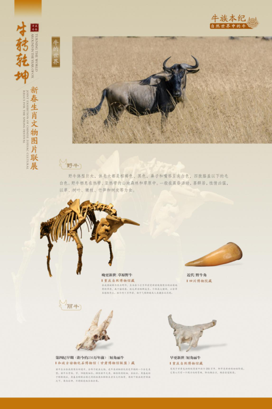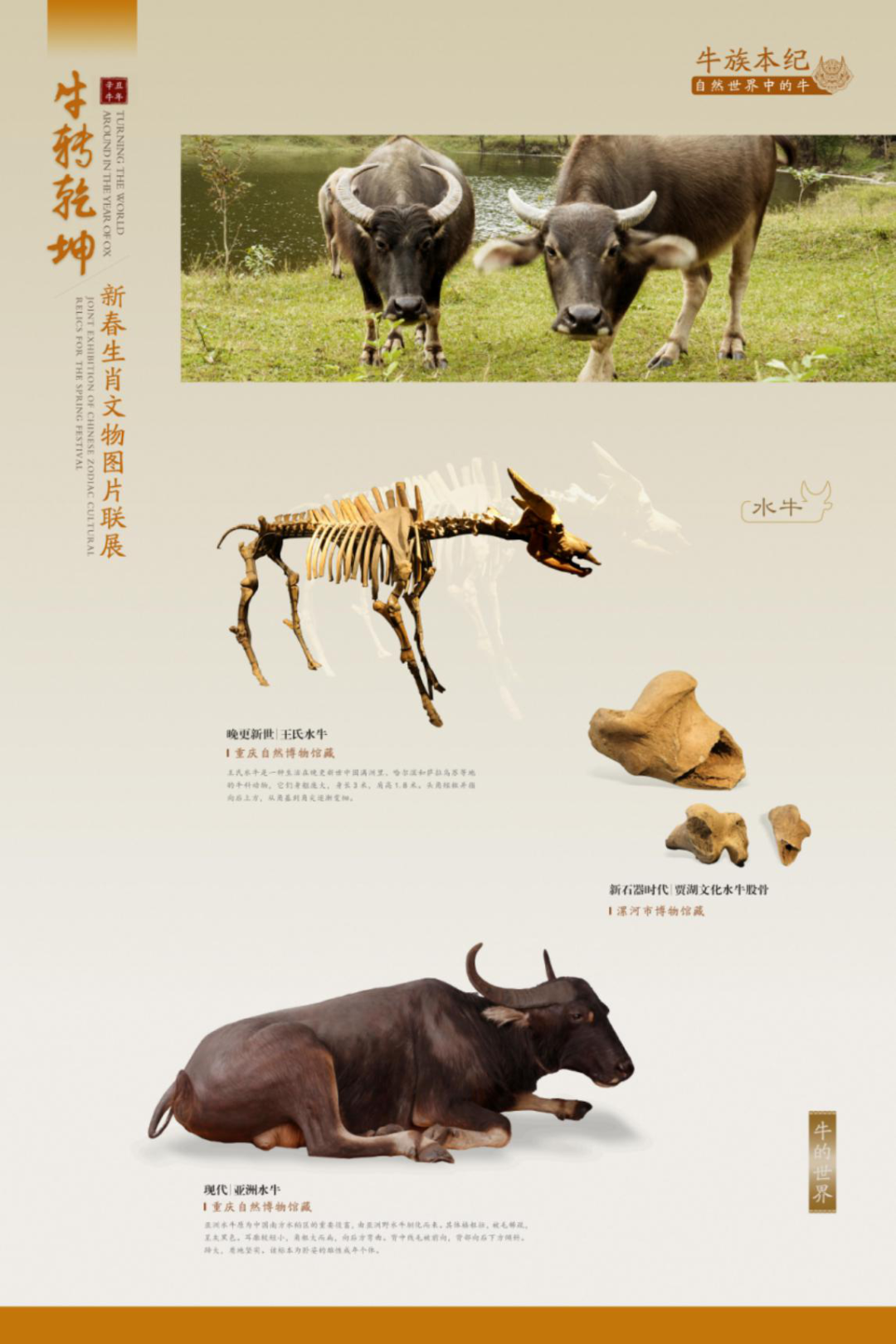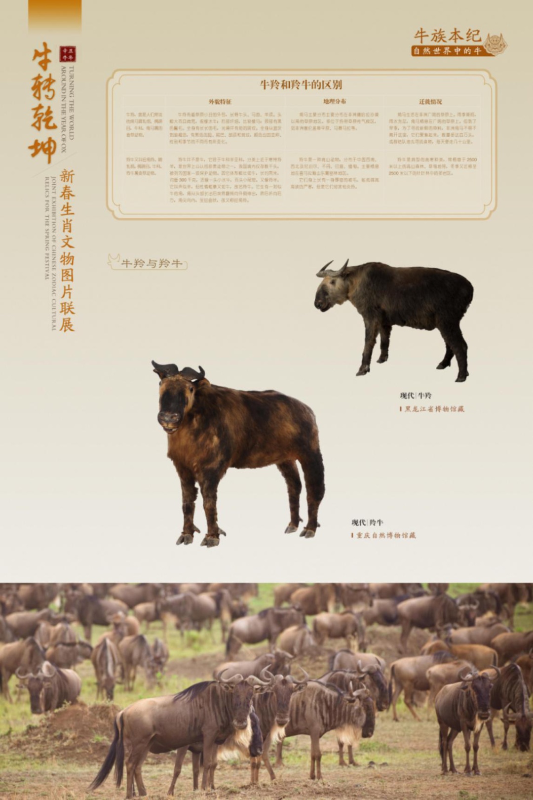 展示自然世界中种类丰富的牛。牛,属哺乳纲,偶蹄目,通常特指牛科下属牛属、水牛属、倭水牛属、非洲野牛属和野牛属的动物。除极寒、极旱等极端恶劣环境外,牛在全球广泛分布,数量极多,与人类生活关系极为密切。