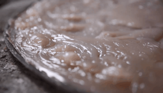 天水谚语“馓饭若要好,三百六十搅”,做呱呱也一样。把荞麦淀粉均匀地撒在开水锅里,边撒边搅动。刚出锅的热呱呱,冒着诱人的泡泡,与香辣奔放的酱汁调匀,无论是直接吃,还是加入热腾的白吉馍里,都是无与伦比的晨间美味!