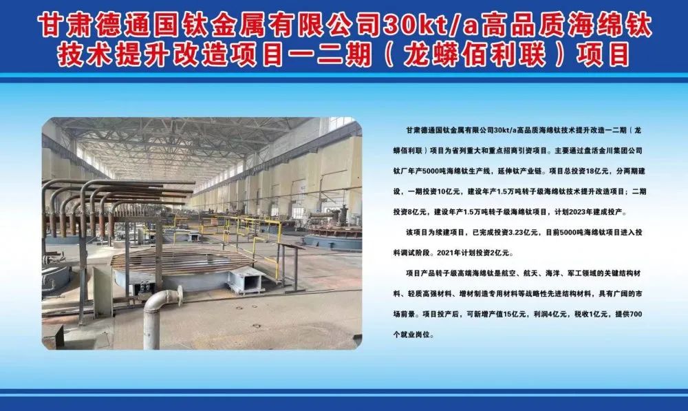 甘肃德通国钛金属有限公司30kt/a高品质海绵钛技术提升改造项目一二期(龙蟒佰利联)项目为省列重大建设项目和重点招商引资项目。主要基于金川集团钛厂现有资产(5000吨/年海绵钛生产线),注册成立甘肃德通国钛金属有限公司通过盘活现有闲置资产,共同发展钛产业链系列产业。项目总投资18亿元,共分两期建设。一期投资10亿元,建设年产1.5万吨转子级海绵钛技术提升改造项目(改造5000吨海绵钛生产线先期恢复生产,新建1万吨生产线);二期投资8亿元,新建年产1.5万吨转子级海绵钛项目,计划于2023年建成投产。