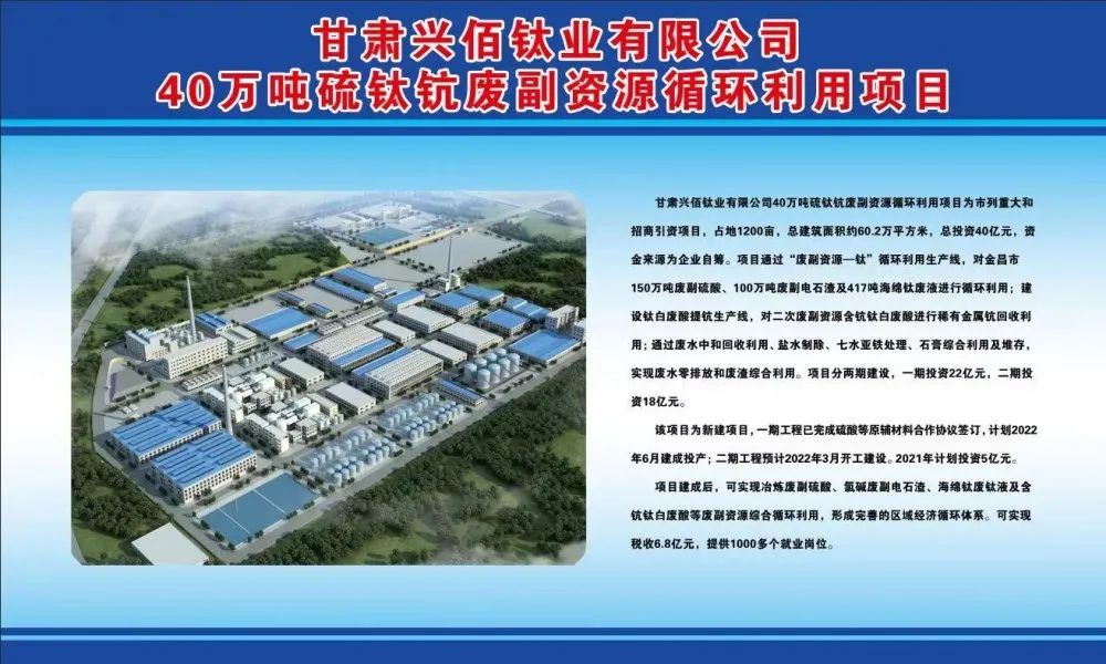 甘肃兴佰钛业有限公司40万吨硫钛钪废副资源循环利用项目为市列重大建设项目和招商引资项目,占地1200亩,总建筑面积约60.2万平方米,总投资40亿元(不含研发费用),资金来源为企业自筹。该项目通过“废副资源—钛”循环利用生产线对金昌市150万吨废副硫酸100万吨废副电石渣及417吨海绵钛废液实现循环利用;通过建设钛白废酸提钪生产线,对二次废副资源含钪钛白废酸进行稀有金属钪金属再生资源回收利用;通过废水中和回收利用及制除盐水、七水亚铁处理外销、石膏综合利用及堆存等三废处理方式实现废水零排放、废渣综合利用。