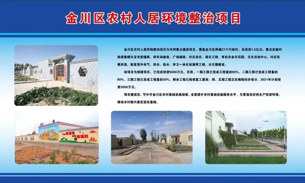 金川区农村人居环境整治项目为市列重点建设项目,覆盖金川区两镇27个行政村,总投资1.5亿元。重点实施村组道路硬化及宅前铺装、停车场建设、广场铺装、村庄亮化、绿化工程 、有机农业示范园、文化活动中心、村庄风貌改造,配套室外电气、供水、给水、环卫一体化 设施等工程,分五期建设。