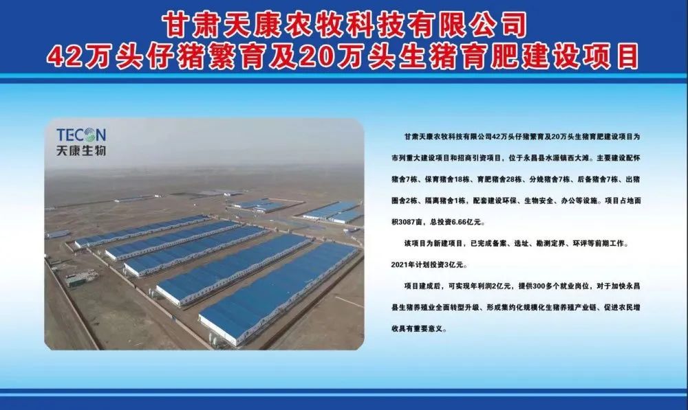 甘肃天康农牧科技有限公司42万头仔猪繁育及20万头生猪育肥建设项目为市列重大建设项目和招商引资项目,位于永昌县水源镇西大滩。主要建设配怀猪舍7栋,保育猪舍18栋,育肥猪舍28栋,分娩猪舍7栋,后备猪舍7栋,出猪圈舍2栋,隔离猪舍1栋,配套建设环保工程、办公、生物安全设施及生活附属设施。项目占地面积3087亩,概算总投资6.66亿元。
