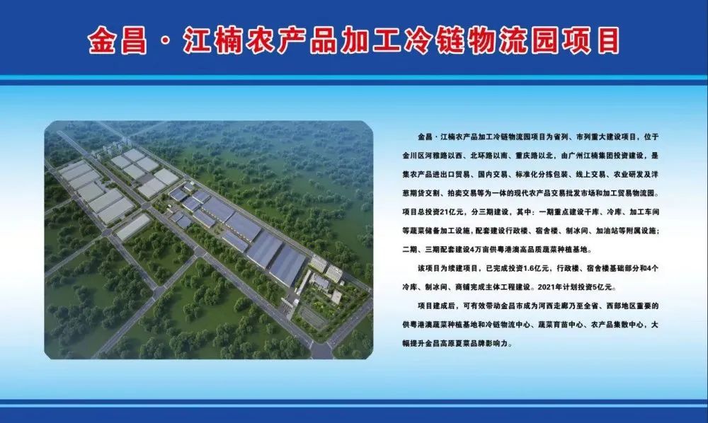 金昌·江楠农产品加工冷链物流园项目为省列、市列重大建设项目,由广州江楠集团投资建设,是集农产品进口贸易、国内交易、标准化分拣包装、互联网线上交易、大数据、农业研发及洋葱期货交割、拍卖交易等为一体的现代农产品交易批发市场和加工物流园。该项目位于金川区河雅路以西、北环路以南、重庆路以北,总投资21亿元,计划分三期建设,其中:项目一期投资8亿元,重点建设干库、冷库、加工车间等蔬菜储备加工设施,配套建设行政楼、宿舍楼、制冰间、加油站等附属设施;项目二期、三期投资10亿元。规划总用地面积120.99万平方米,总建筑面积103万平方米,配套建设4万亩供粤港澳高品质蔬菜种植基地。