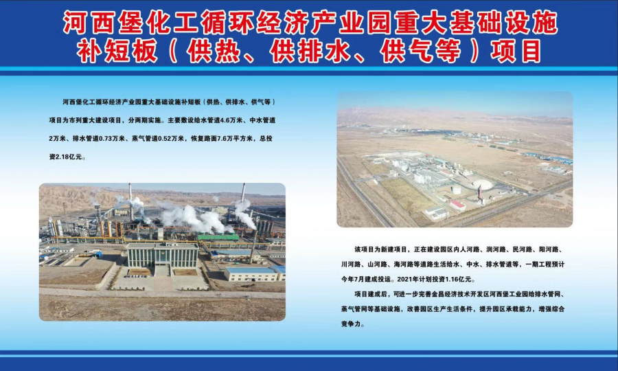 河西堡化工循环经济产业园重大基础设施补短板(供热、供排水、供气等)项目为市列重大建设项目,分两期实施。主要新建给水管道4.6万米、中水管道2万米、排水管道0.73万米、蒸气管道0.52万米,恢复路面7.6万平方米,概算总投资2.18亿元。