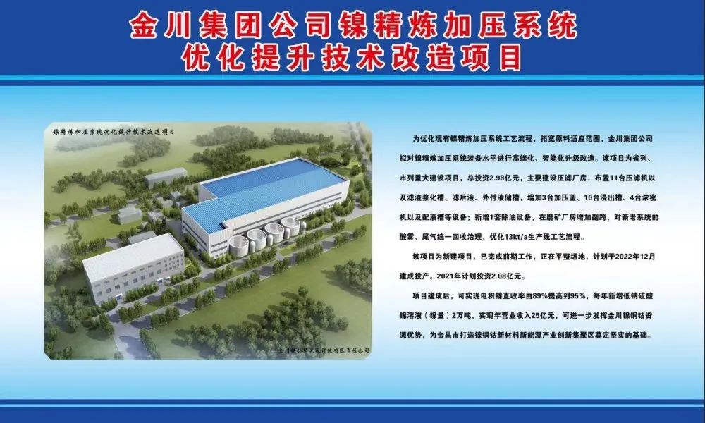 为优化现有镍精炼加压系统工艺流程,拓宽原料适应范围,金川集团公司拟对系统装备水平进行高端化、智能化升级改造,该项目为省列、市列重大建设项目,主要建设压滤厂房,布置11台压滤机以及滤渣浆化槽、滤后液、外付液储槽,增加3台加压釜、10台浸出槽、4台浓密机以及配液槽等设备;新增1套除油设备,在磨矿厂房增加副跨,对新老系统的酸雾、尾气统一回收治理。项目总投资2.98亿元。