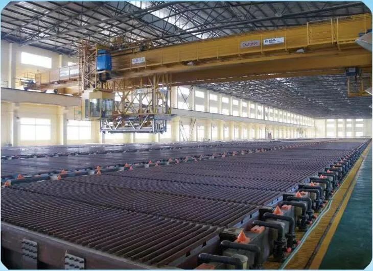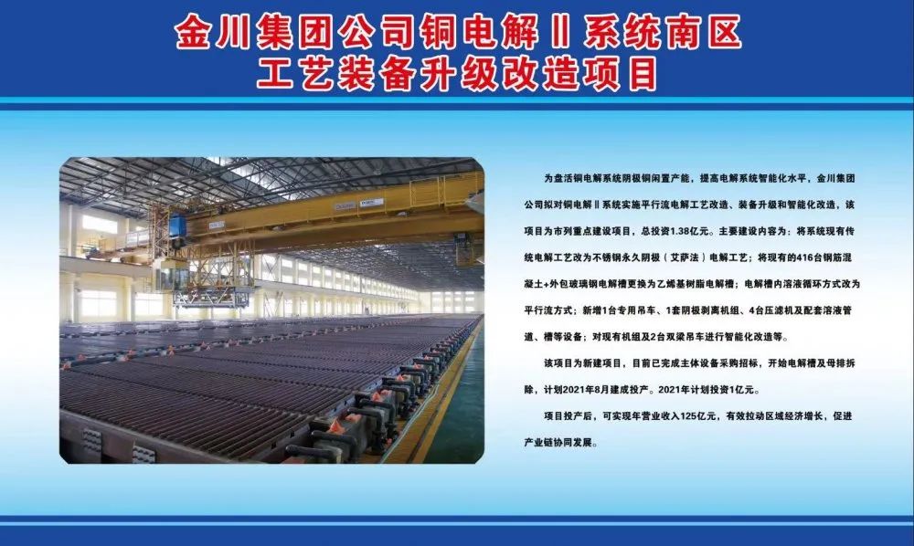 为盘活铜电解系统阴极铜闲置产能,提高电解系统智能化水平,金川集团公司实施铜电解Ⅱ系统实施平行流电解工艺改造、装备升级和智能化改造,该项目为市列重大建设项目,主要将现有传统电解工艺改为不锈钢永久阴极(艾萨法)电解工艺;将现有的416台钢筋混凝土+外包玻璃钢电解槽更换为乙烯基树脂电解槽;电解槽内溶液循环方式改为平行流方式;新增1台专用吊车、1套阴极剥离机组、4台压滤机及配套溶液管道、槽等设备;总投资1.38亿元。