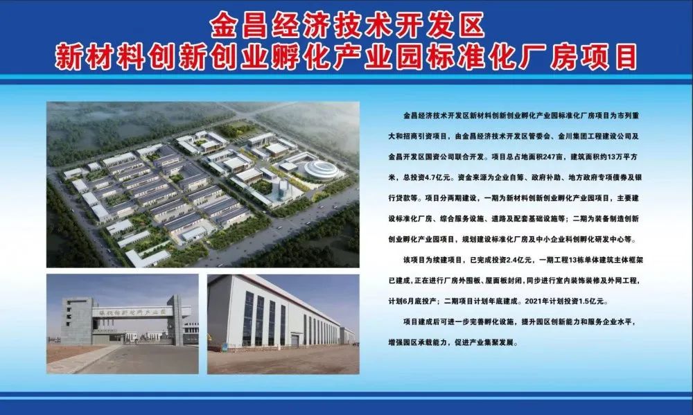 金昌经济技术开发区新材料创新创业孵化产业园标准化厂房工程建设项目为市列重点建设项目和招商引资项目,由金昌经济技术开发区管委会、金川集团工程建设有限公司及金昌开发区国资公司联合开发,项目总占地面积247亩,建筑面积约13万平方米,总投资约4.7亿元,资金来源为企业自筹、各级政府补助资金、地方政府专项债券资金、银行贷款等。项目分二期建设,一期为新材料创新创业孵化产业园项目,主要建设标准化厂房、综合服务设施、道路及配套基础设施等,占地面积139亩;二期为装备制造创新创业孵化产业园项目,占地面积约108亩,规划建设标准化厂房及中小企业科创孵化研发中心等。