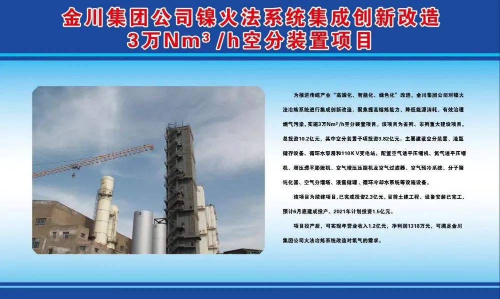 为推进传统产业“高端化、智能化、绿色化”改造,金川集团公司对镍火法冶炼系统进行集成创新改造,聚焦提高熔炼能力、降低能源消耗、有效治理烟气污染,实施3万Nm3/h空分装置项目,该项目为省列、市列重大建设项目。主要建设空分装置、液氩储存设备、循环水泵房和110KV变电站,配置空气透平压缩机、氮气透平压缩机、增压透平膨胀机、空气增压压缩机及空气过滤器、空气预冷系统、分子筛纯化器、空气分馏塔、液氩储罐,循环冷却水系统等设施设备,总投资10.2亿元,其中空分装置子项投资3.82亿元。