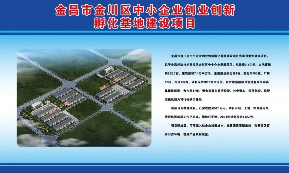 金川区中小企业创业创新孵化基地建设项目为市列重大建设项目,位于金昌国家级经济技术开发区金川区中小企业承载园区,估算总投资约3.4亿元,总用地面积约282.7亩,总建筑面积7.4万平方米,规划建设1栋综合楼、5栋孵化车间、12栋厂房、7栋库房和3个门房。规划建设承载园区供热管网、蒸汽管网、中水管网、公共绿地、防护绿地、重庆路等工程。项目采取BOT运作方式进行,先行实施一、二期,占地面积约180.6亩,建筑总面积4.3万平方米,包括2栋孵化车间,11栋标准化厂房,2栋标准化库房,总投资约2.5亿元,由金川区工业和信息化局负责实施,甘肃聚建项目管理有限公司具体建设运营,合作期为17年,资金来源为项目资本金和银行融资,投资回报机制为可行性缺口补助。