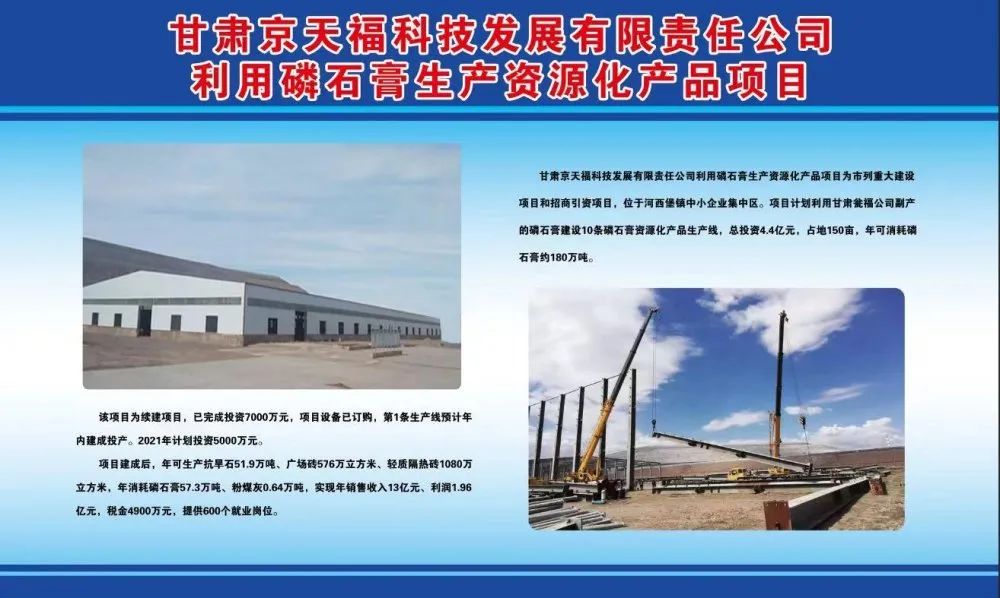 甘肃京天福科技发展有限责任公司利用磷石膏生产资源化产品项目为市列重大建设项目和招商引资项目,位于河西堡镇中小企业集中区,占地150亩,计划利用甘肃瓮福公司副产的磷石膏建设10条磷石膏资源化产品生产线,年可消耗磷石膏约180万吨。项目分四期实施,前三期概算总投资4.4亿元,计划建设4条磷石膏资源化产品生产线,投资强度约293万元/亩,资金来源为企业自筹。